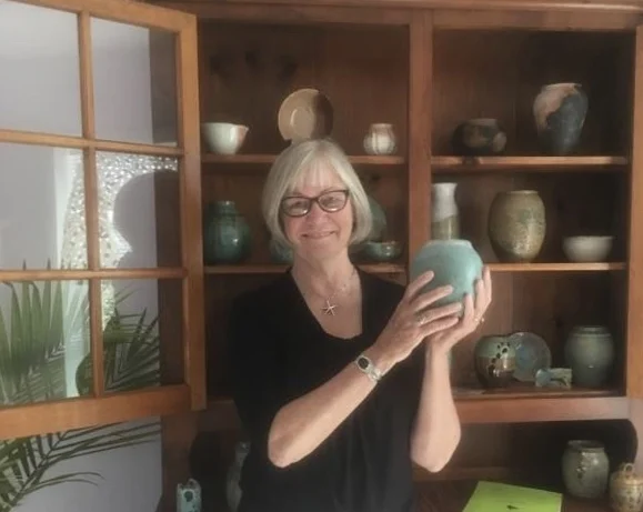 She makes primarily functional, wheel-thrown pieces such as vases, mugs, bowls, and pitchers. Most are glazed in an electric kiln. Some decorative pieces have been pit-fired or hand-built.